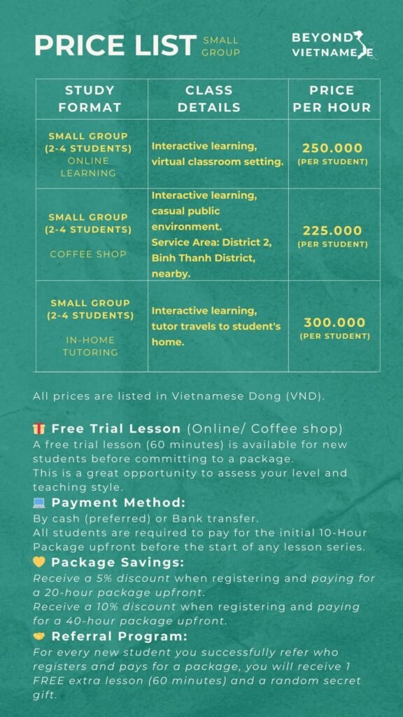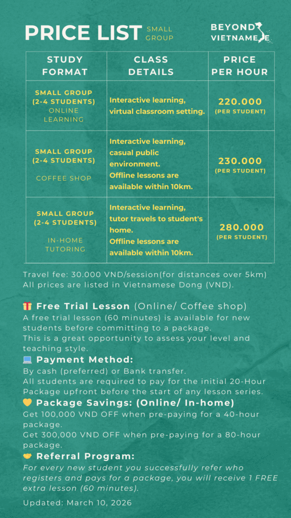 At Beyond Vietnamese, learning goes beyond grammar and vocabulary. We focus on helping learners communicate naturally, understand Vietnamese culture and mindset, and build confidence in real-life situations.