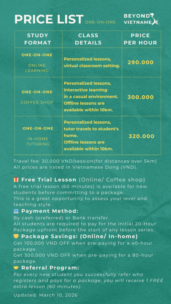 Lessons are interactive, personalized, and always filled with stories, humor, and real examples from daily life in Vietnam.